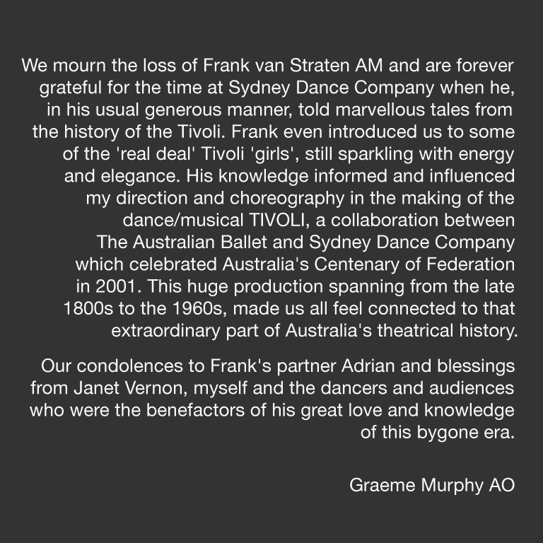 Frank van Straten AM passed away on 19 April 2024. He was a celebrated Australian performing arts historian, author and former director of the Performing Arts Museum at the Arts Centre, Melbourne. In recognition of his services to the performing arts in Australia, Van Straten was awarded the Medal of the Order of Australia (OAM).